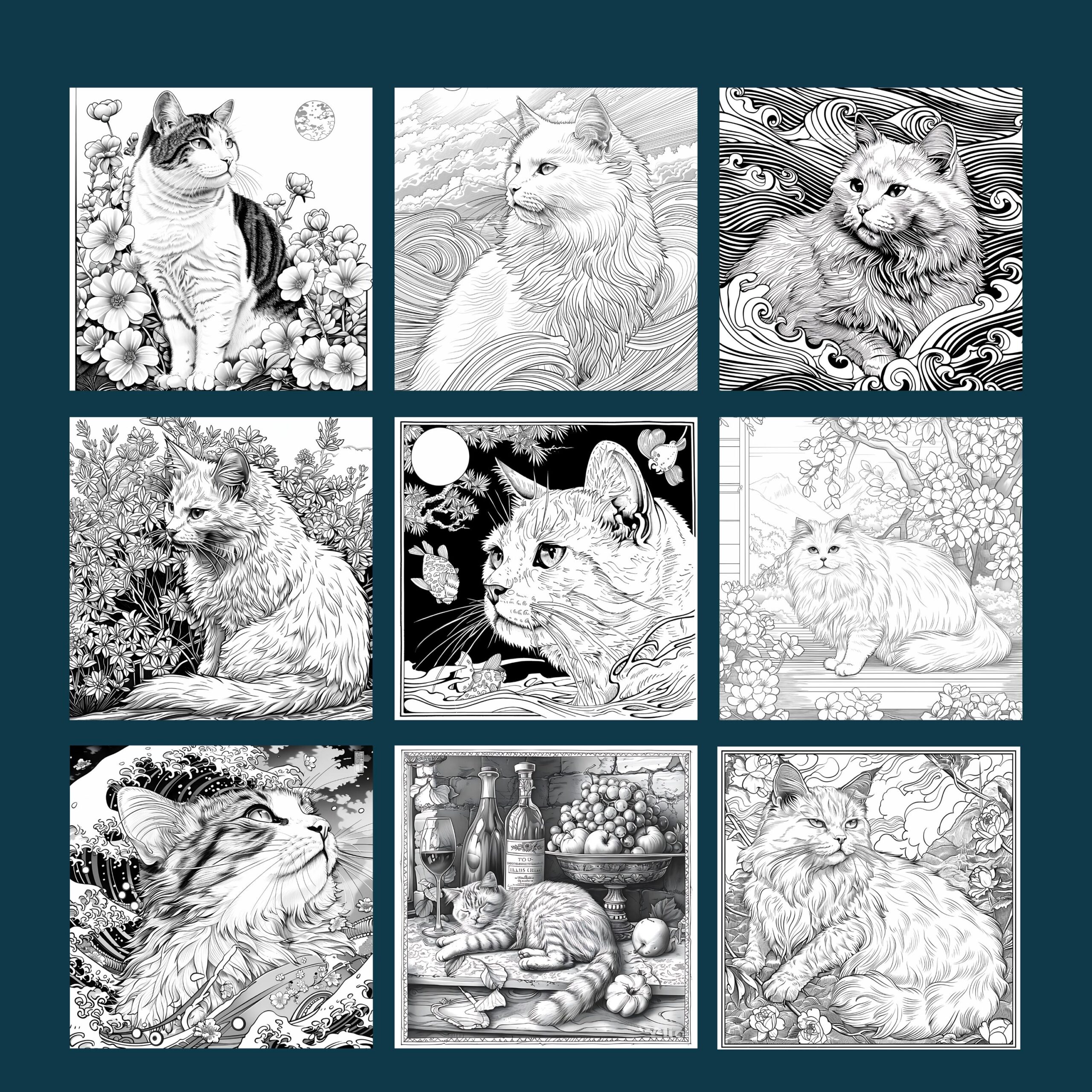 This printable coloring book includes 50 Fabulous Felines in Fine Art context illustrations—graceful setting, curious cats, and intricate feline designs for focus, mindfulness, and creative flow.